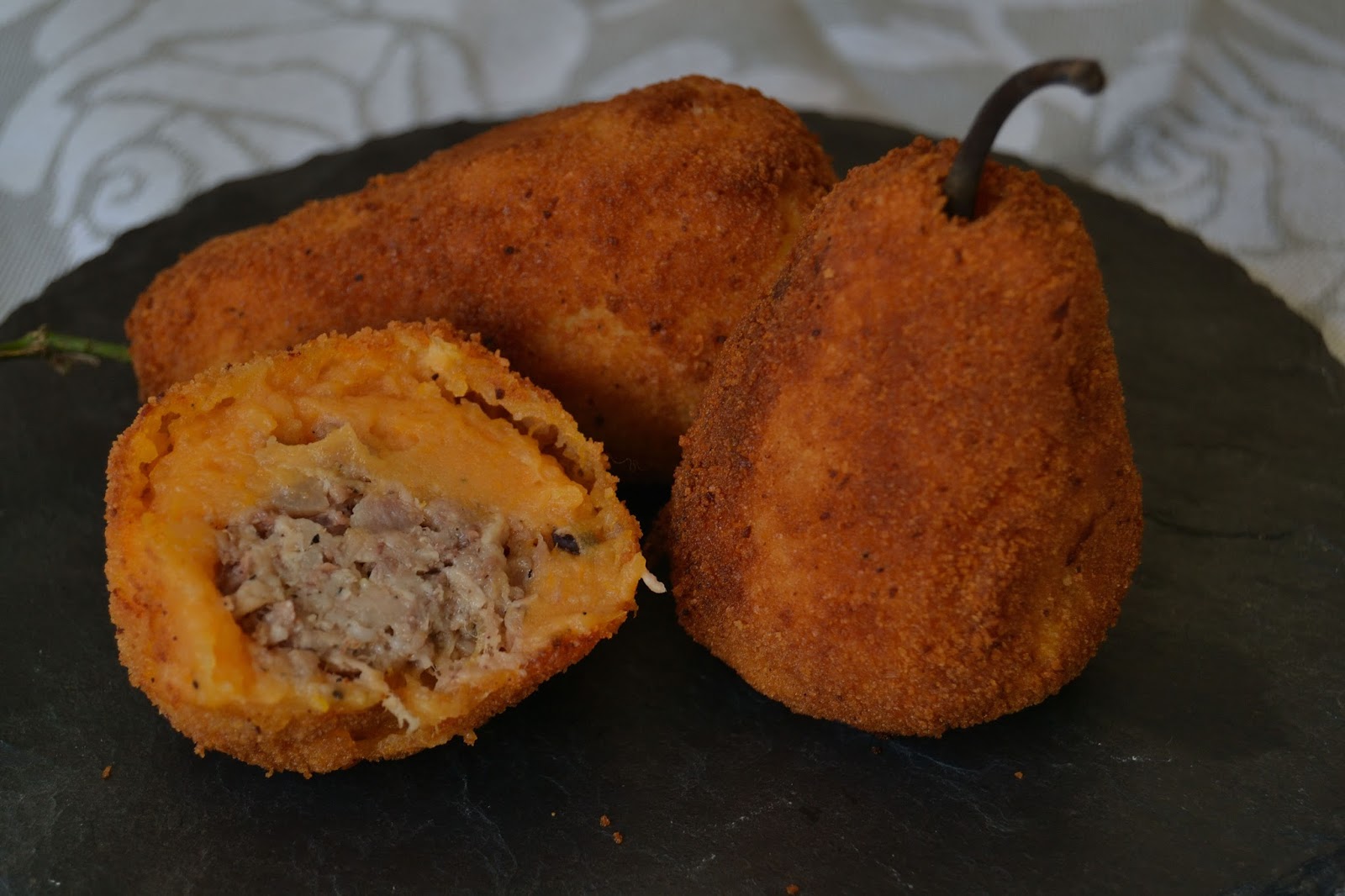 Cocer las patatas y los boniatos. Pelar y hacer un puré, añadir una nuez de mantequilla, sal, pimienta y los pimentones. Formar unas bolas y hacer un agujero dónde colocar el relleno, formar una perita y pasar por harina, huevo y pan rallado. Freír en aceite muy caliente.