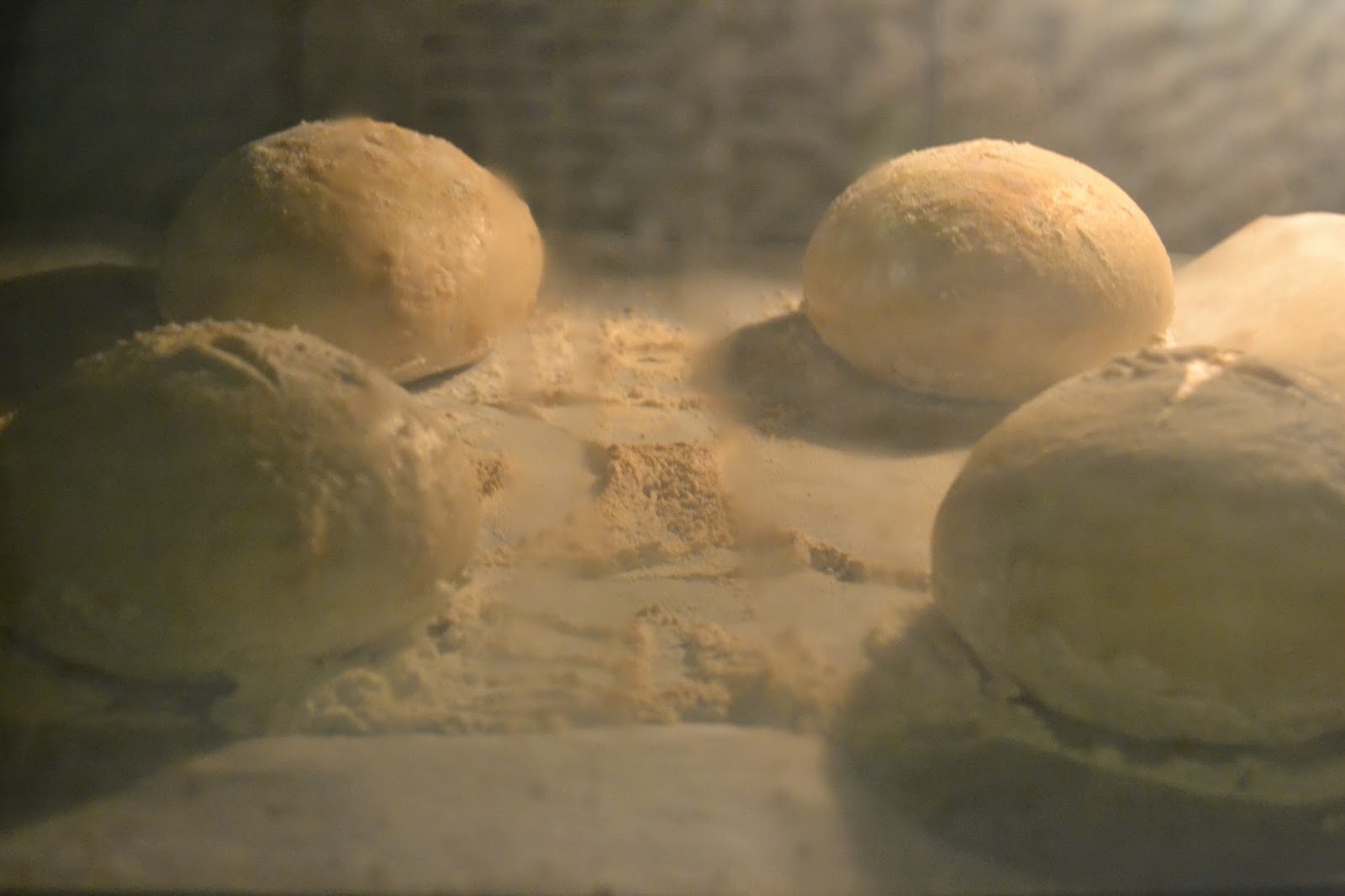 Precalentamos el horno a 250 ºC. Marcamos nuestros panecillos con una cruz antes de meterlos en el horno y echamos medio vaso de agua en la base del horno. Transcurrido cinco minutos, abrimos la puerta del horno y contamos unos diez segundos al fin de que salga el vapor. Seguimos cociendo a la misma temperatura diez minutos más, bajamos el horno a 220 ºC. y dejamos cinco minutos más.
