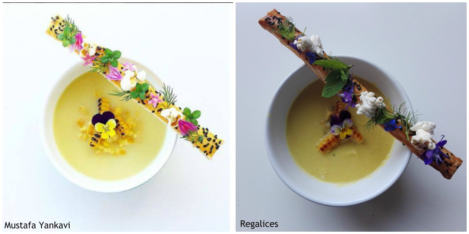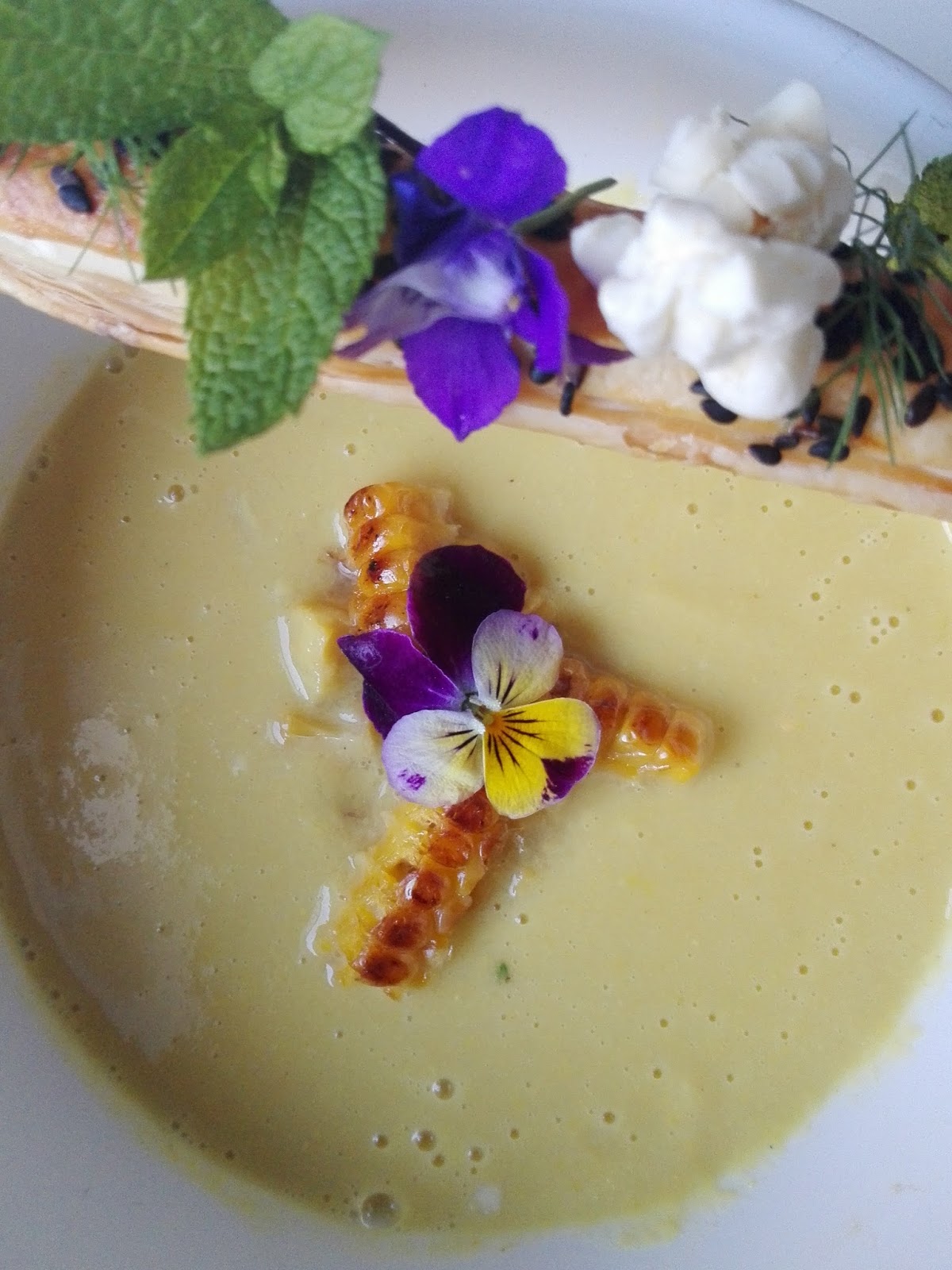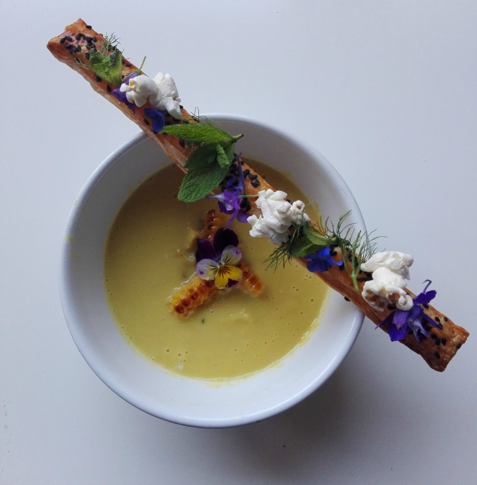 Equilibrismo sobre crema de maíz al curri.